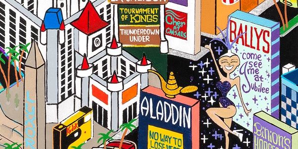 Josh Blaney wanted to create the same aerial perspective of Fremont street to compare the architectural differences over 50+ years. Josh calls this painting "Love is in the Air" and "Just Married". More people come Las Vegas to get married than any other destination.